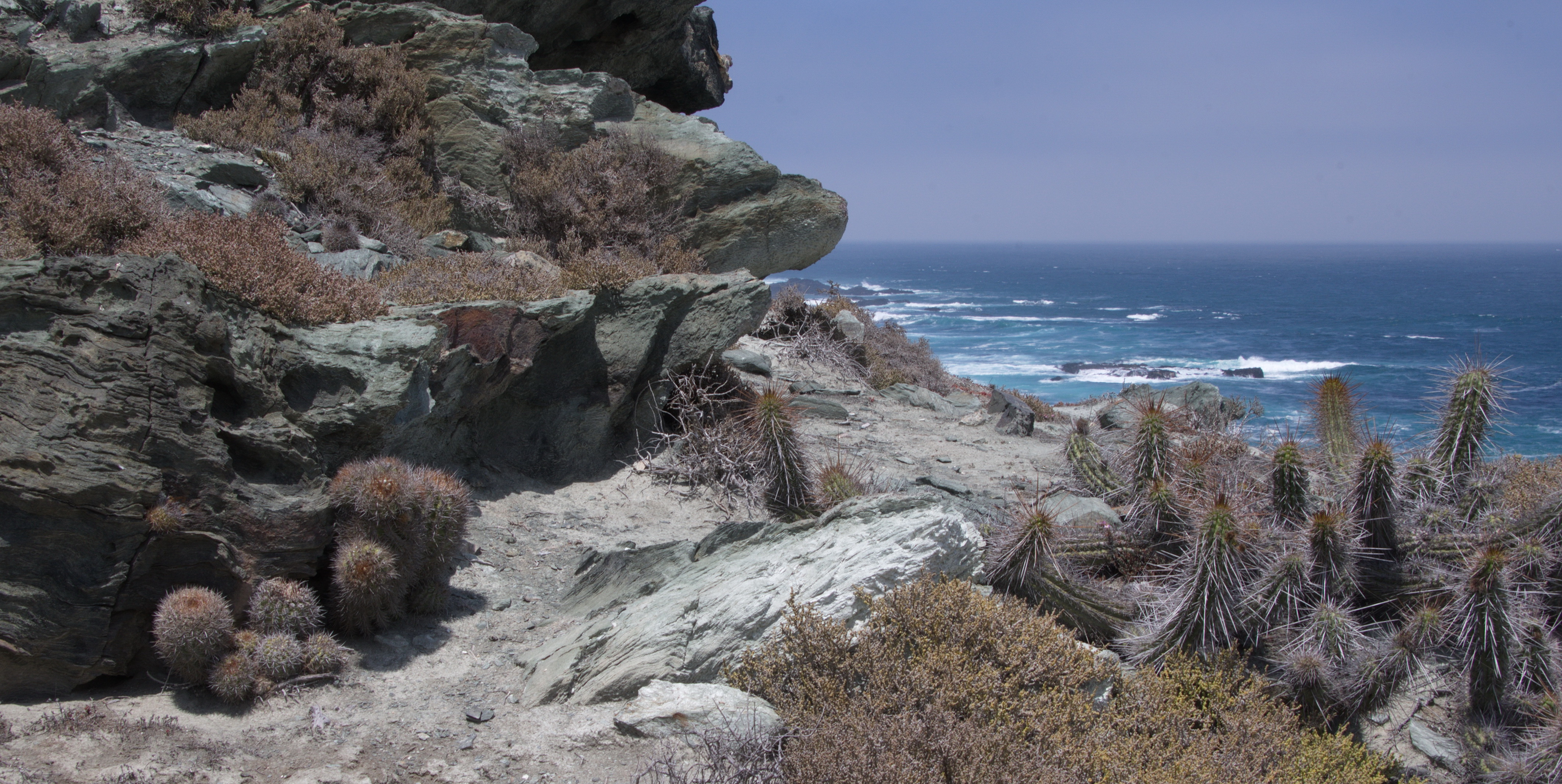 All this again despite the evidence of any other traffic. That waited until I had reached the bottom of the hill and a wide strip of flat sandy land covered in Eulychnia castanea, all the way to a strip of white sand and then the Ocean. This seemed the ideal spot for a toilet stop and as I was enjoying the scenery, a large Skanska truck squeezed by my car on the track and honked its horn. Yes, hi!