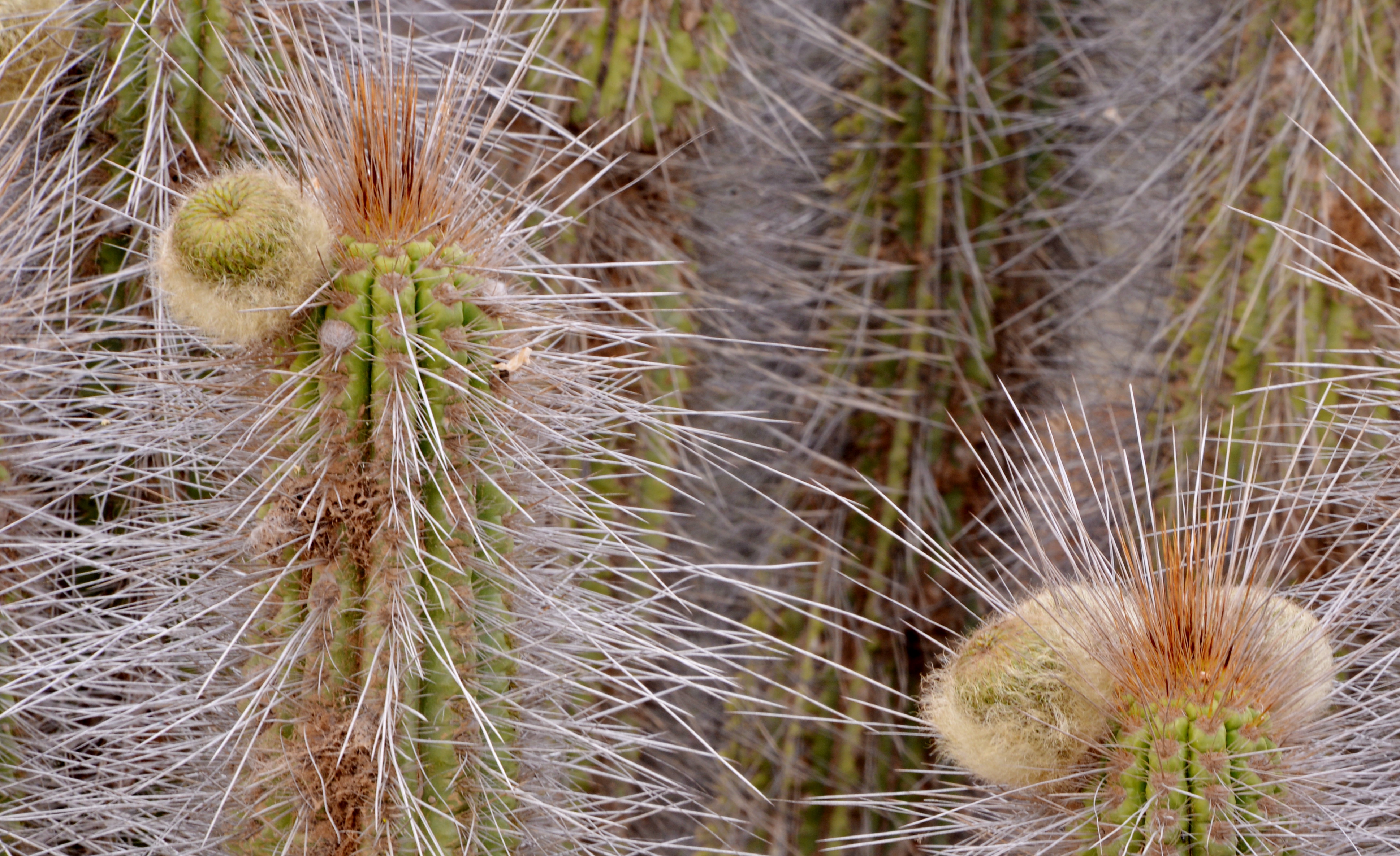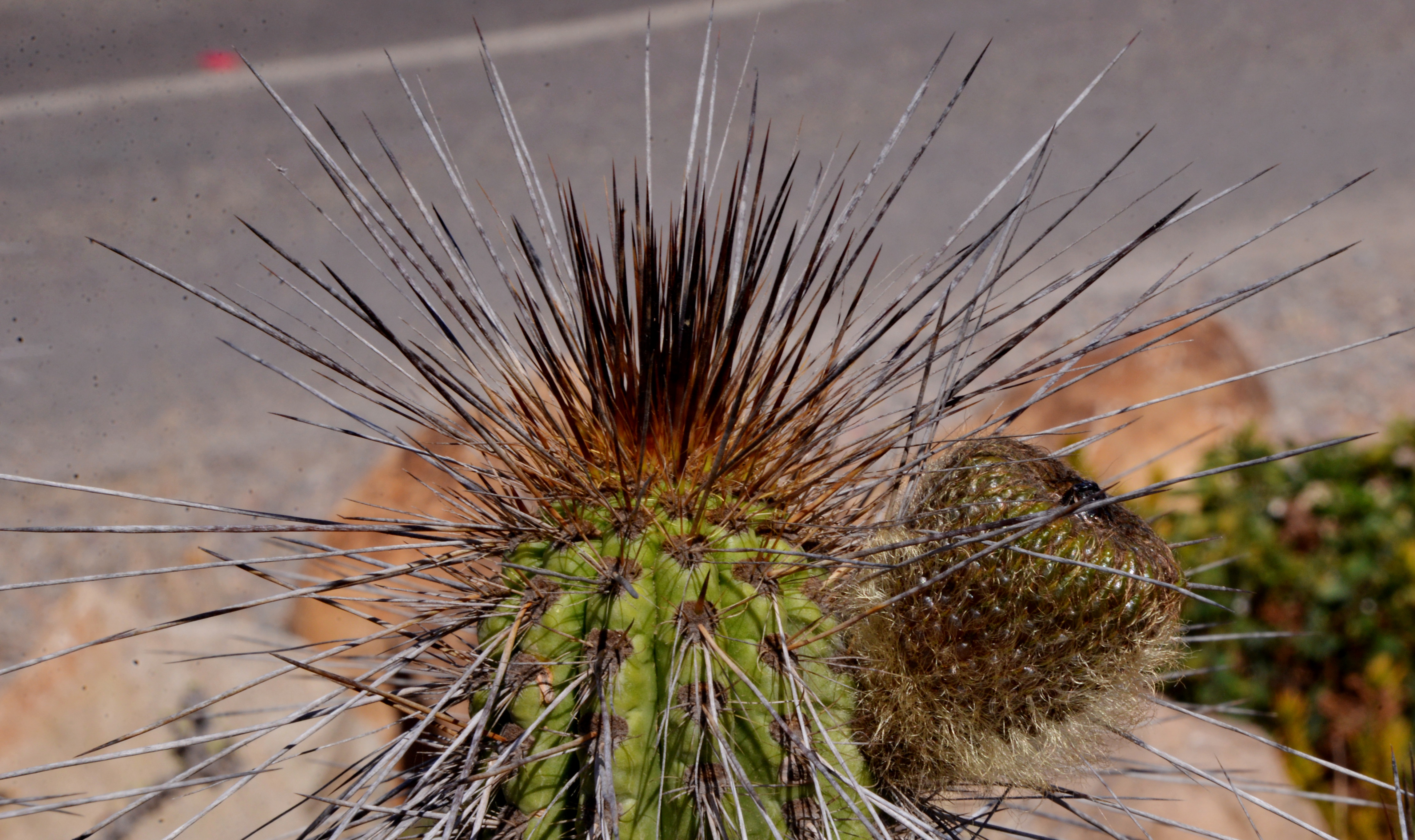Back on the beach – the Eulychnia had all but swamped any other vegetation. There were still a few flowers but in the main, the plants were in fruit. This confirmed something that I had suspected but had not yet been able to photograph for castanea, that when ripe, all Eulychnia fruit swell up so that the characteristics of the hypanthium: degree of hairiness or spininess becomes less dramatic, with all adornments eventually rubbing off. The weight of the swollen fruit is such that they readily drop off and are then the food for small rodents and birds. I had noticed this before with E. acida and E.breviflora where the ripe fruits made regular ‘plopping’ noises as they fell to the ground and ‘exploded’. Dried fruits that we often see at the base of Eulychnia with the hypanthium dried up and shrivelled away with hairs or spines still in tact are likely to be fruits where the ‘ripening process’ has not been successful, possibly because the seed had not been fertilised or that small ‘worms’ (borer beetle larvae?) had eaten the seed and the fruit had thus failed to produce the ripening hormones.