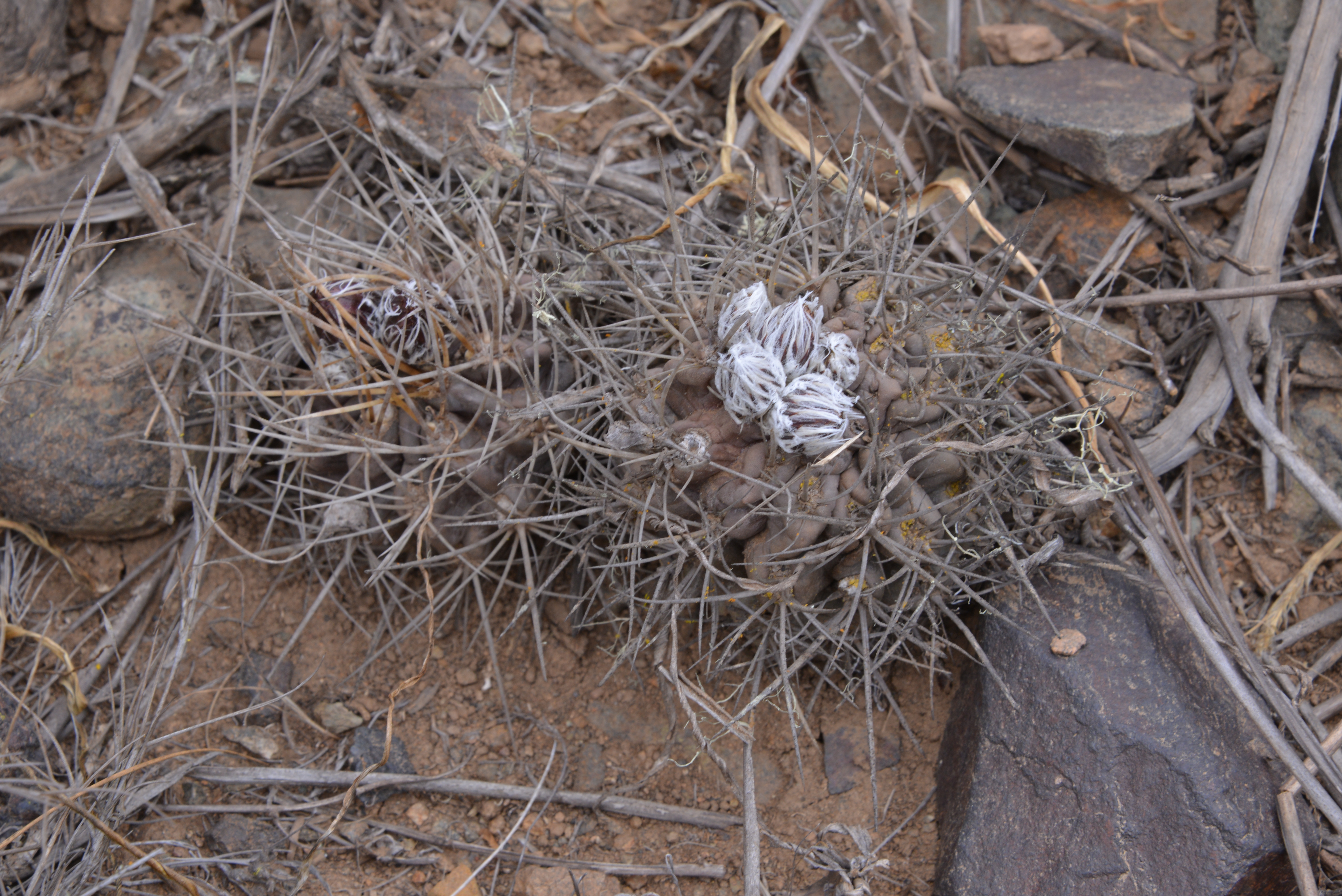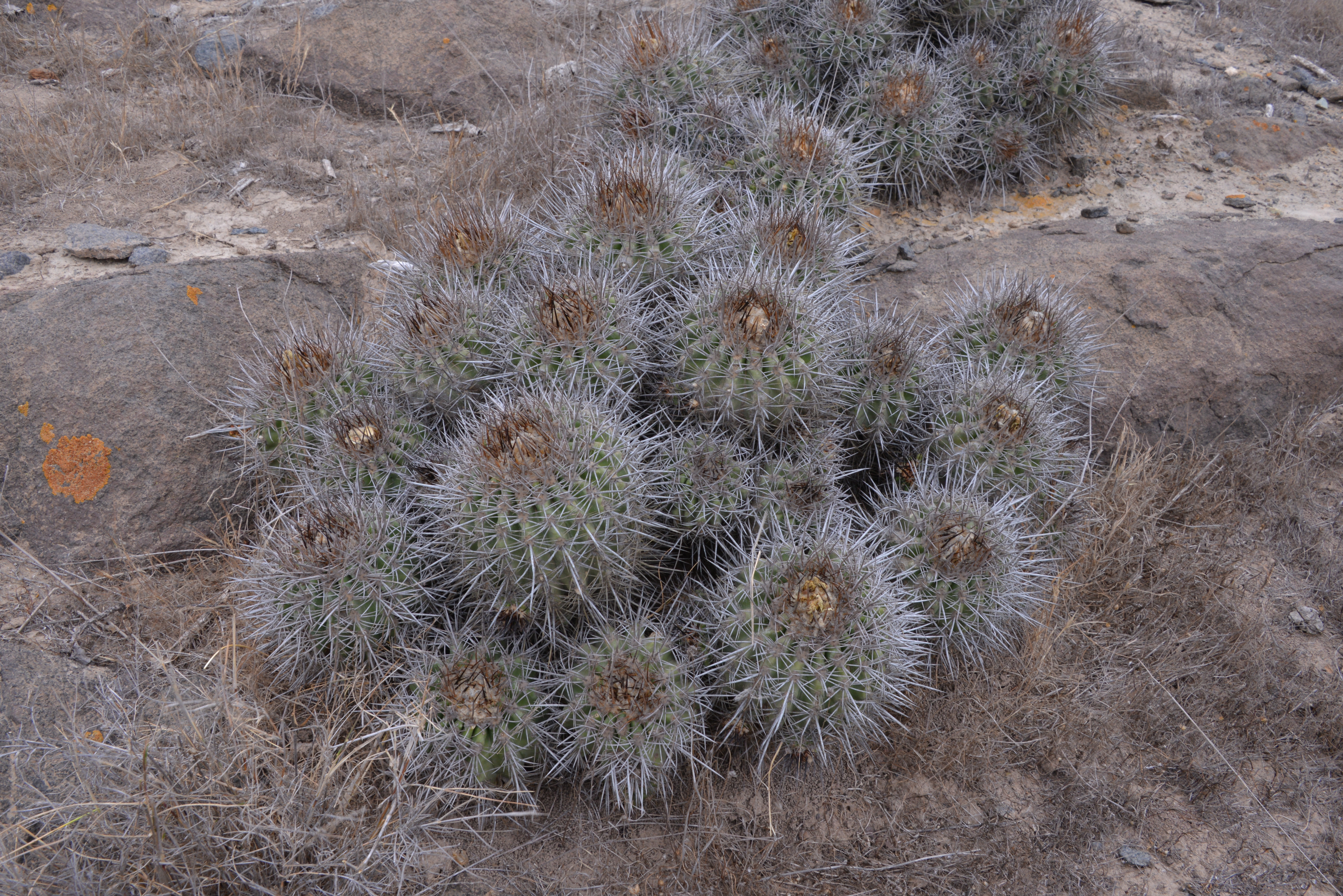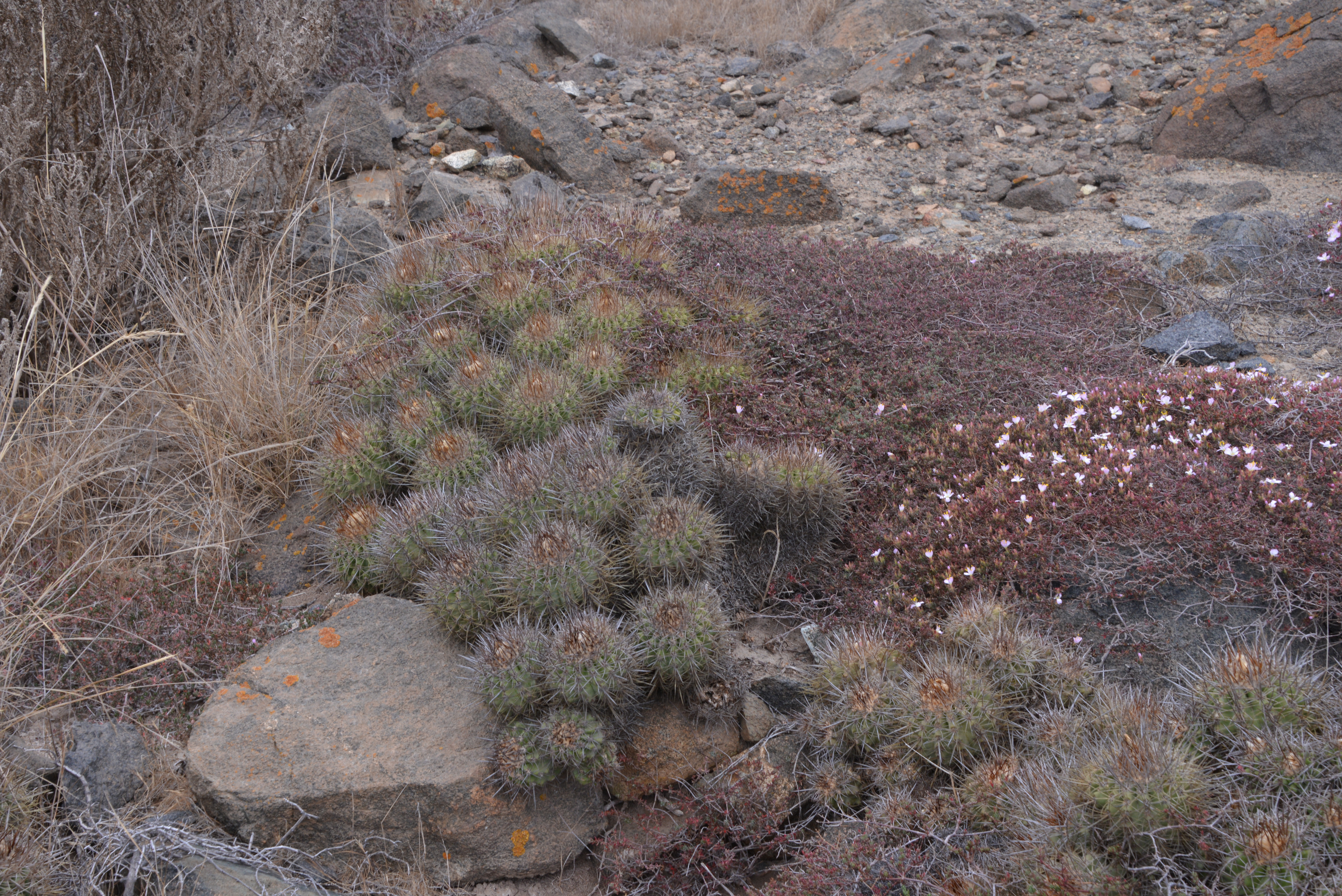 Past Los Hornos there is a turning to a track to Chungungo that we had taken (in the opposite direction) in 2001. It’s alongside a stretch of R5 where we’ve often admired the camanchaca clouds pouring over the hills and with our regular Los Hornos stop taken out by the road widening scheme, we needed a new spot to take a look at the local Copiapoa coquimbana etc. Bart & Marijke had been up this track in 2012, while I had been in South Africa so could report that the quality of track was much improved. We stopped soon after the coquimbana appeared (S2888) – the first for Jonathan, together with an Eriosyce ‘ball of spines’,and Echinopsis (Trichocereus) some with one side covered in bright red fungi or lichen.