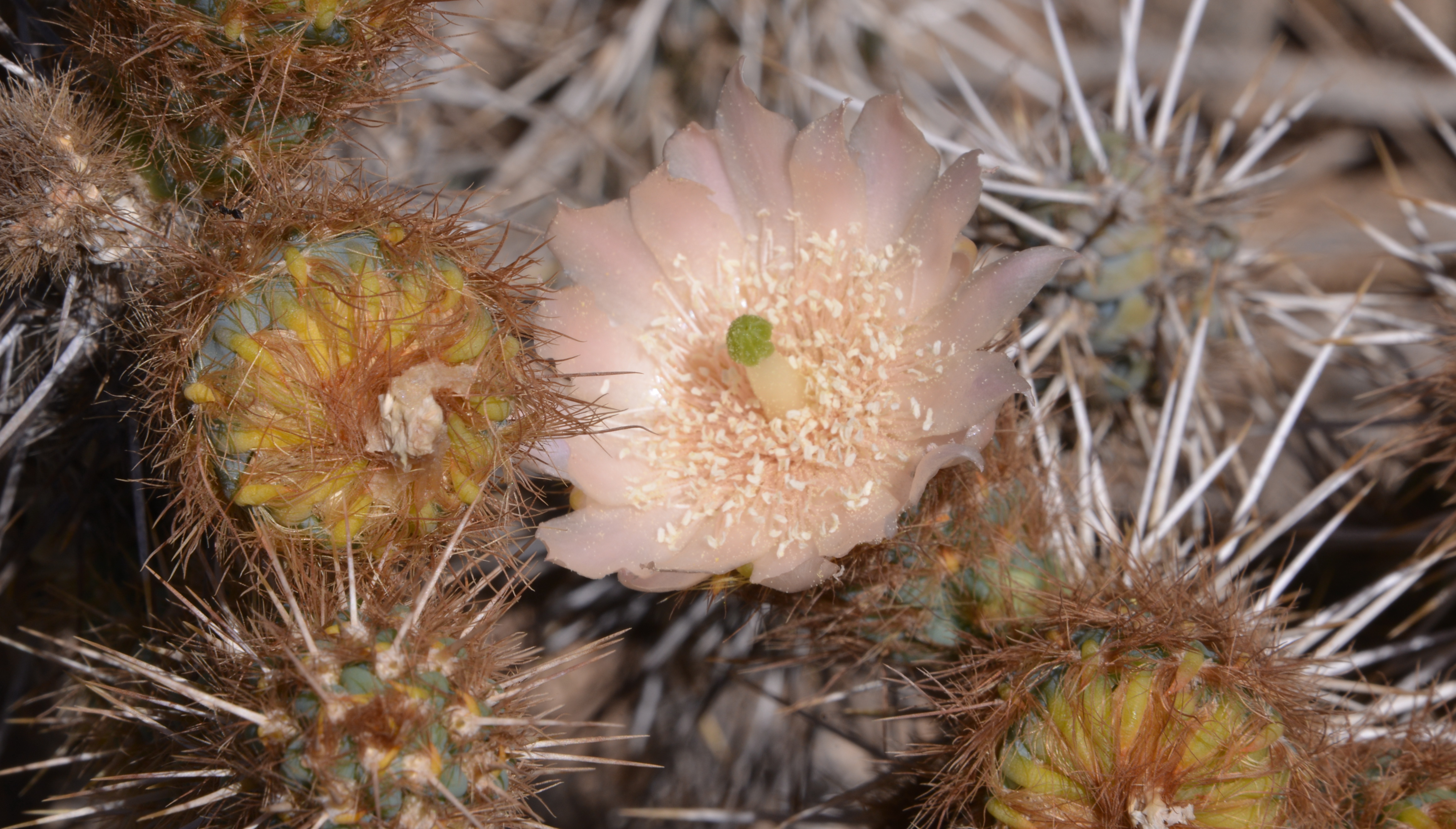 We had gone to Domeyko and stopped at km 16.4 – Ritter’s location for C. domeykoensis – these days just another C. coquimbana. Most of the plants at the base of the rock (one of the windiest places I know) looked dead, but a bit higher on the rocks was one nice plant and when I got to that, two more a bit higher up and so on, so that I ended up much higher than ever before, nearly being blown away in the process. Very nice stop, although for the first 24 images I still had my camera set to ISO 6,400 leading to the most overexposed images ever – but amazingly still rescuable as ‘for the record’ images. Luckily I was able to retake many of the images before we drove on.(S2944).