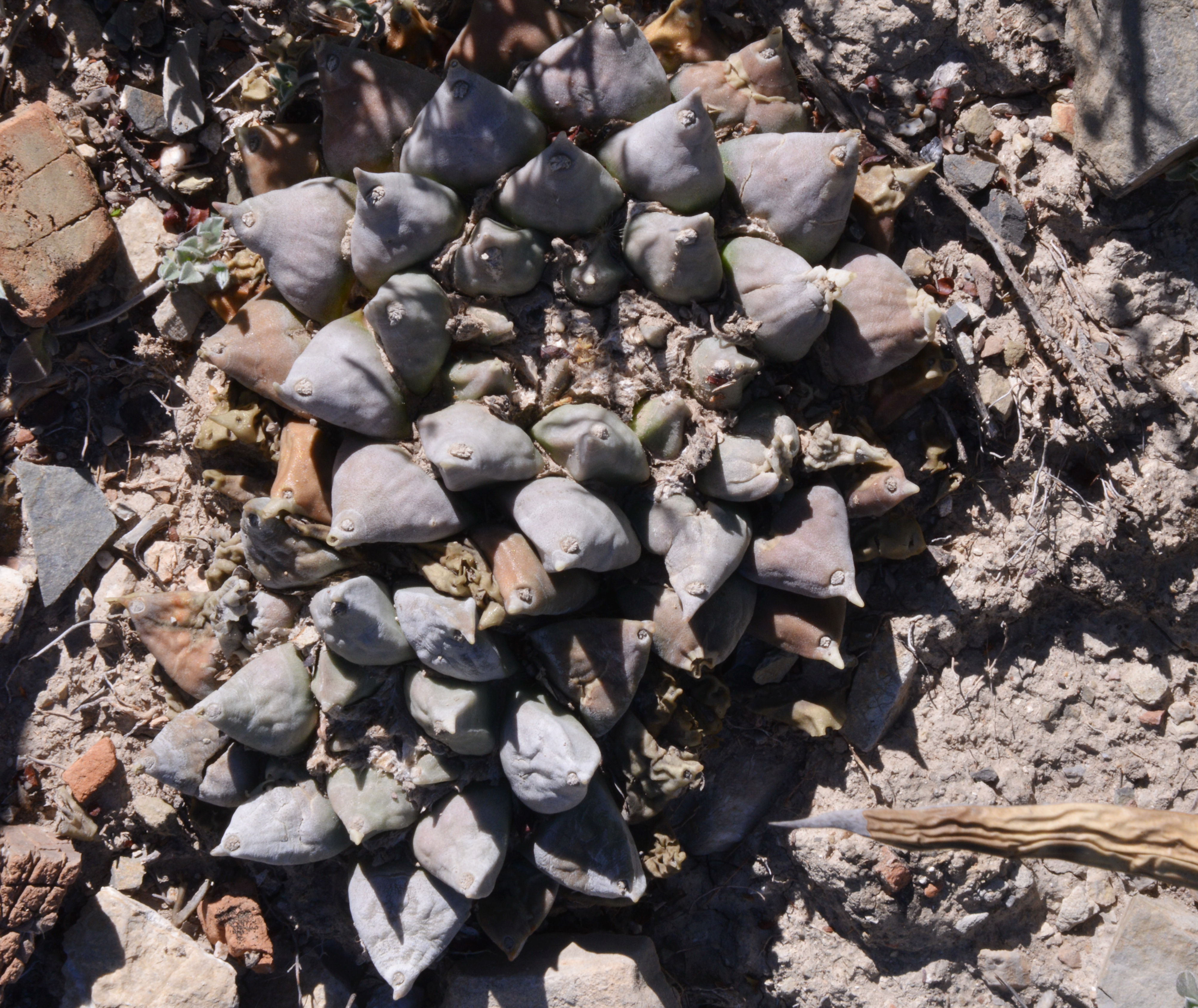 As Cliff steered the car down the narrow twisty roads, avoiding the stone fall that suggested a recent storm, Ian was still able to spot an Ariocarpus retusus between the shrubs on the side of the road (S3069). Good spot! A quick leg-stretch to take its picture and Ian found another Ario, a double header this time.