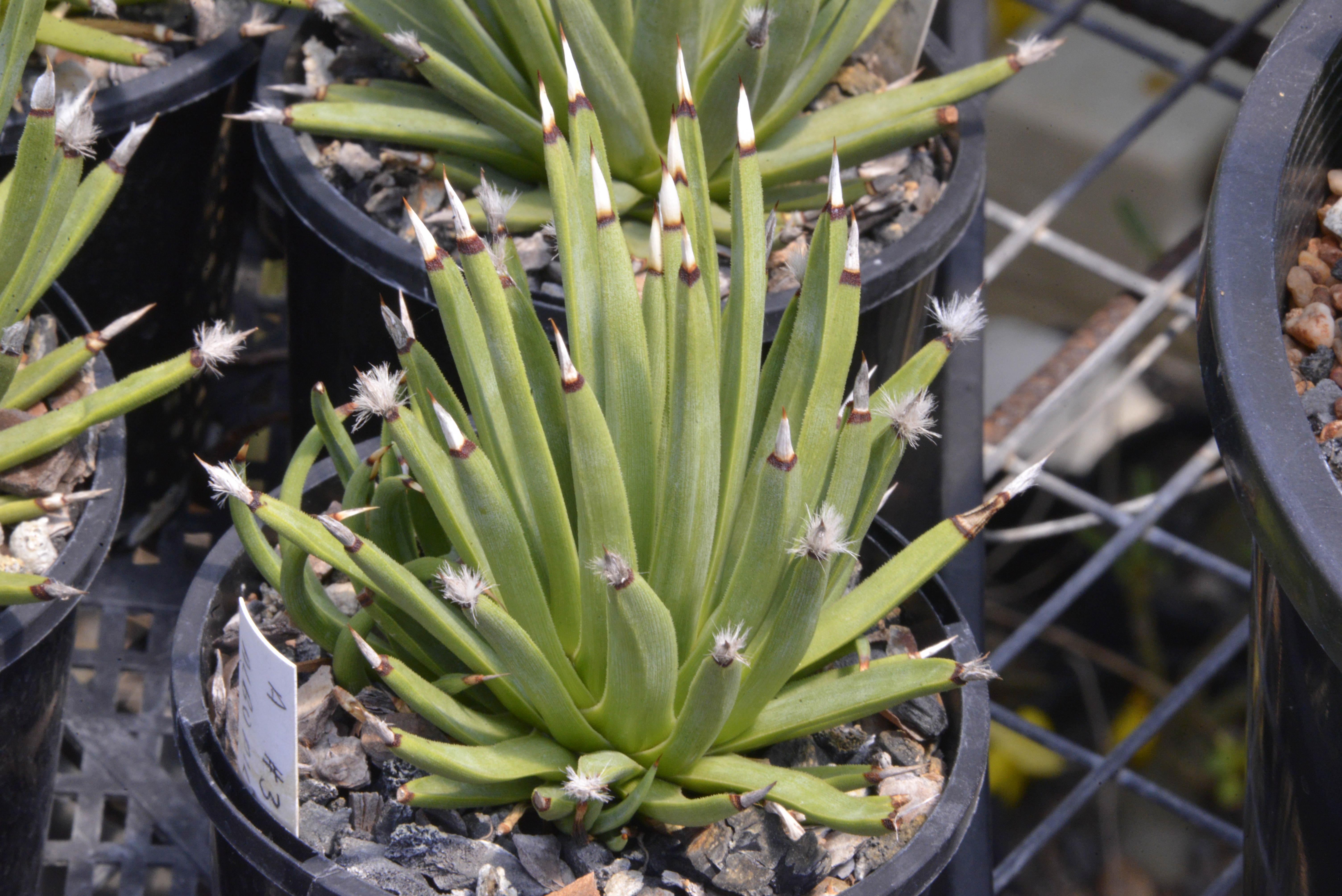 Here in Australia, Spring produced higher temperatures than England in the heat of summer! At the Convention I had shown John and Terry a 6 minute movie clip from a trip through Huasteca Canyon, near Monterrey, NL, that included images of Agave albipilosa. These would be highly desirable plants if the fluffy bits at the end of the leaves were present by the time that nursery men like to take their plants to market, at around 18 months. In England, plants raised from seed some five years ago were still without fluffy bits. Terry said that his plants were some three years of age and had produced their fluffy bits after three years, so I was happy to take some pictures.