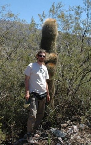Back on the bus, we continued our journey north, with the colours of the hills to the east becoming more prominent as the sun sank lower in the sky. Around 17:30 we stopped east of Maimara (S466) where the geology was particularly fascinating and colourful. After a short stroll, the hills provided a perfect back drop for Trichocereus pasacana, with at their feet a selection of incredibly longspined Echinopsis longispina (better known in the UK by its synonym Lobivia ferox), Gymnocalycium saglionis (to basket ball size!), while we had to wade through thousands of Opuntia sulphurea. I wish that some one had told the Opuntias of our non-collecting agreement, as they attached themselves to foot wear and trousers.