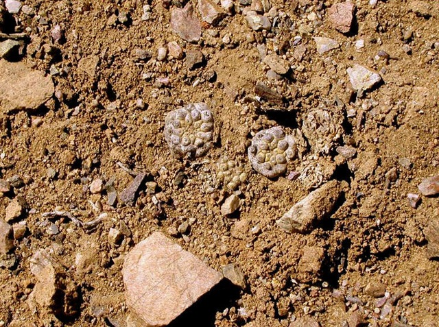 We moved about 10 km farther north for S2080, mainly because of our curiosity in the dried ‘salt lake’ at the foot of some low hills. It turned out to be a dried up mud lake, used as a watering hole for cattle when water is available, judging by the cow pats and goat droppings. Maihueniopsis glomerata had somehow survived, but the rest of the area seemed thrashed. Just as we were about to give up and return to the car, Juan (who else?) found Pterocactus gonjanii, in bud. Just two flower stems sticking out above the soil. They must have shot up after the cattle moved on to better watering holes. Maihueniopsis clavarioides was here too, but looking very shrivelled.