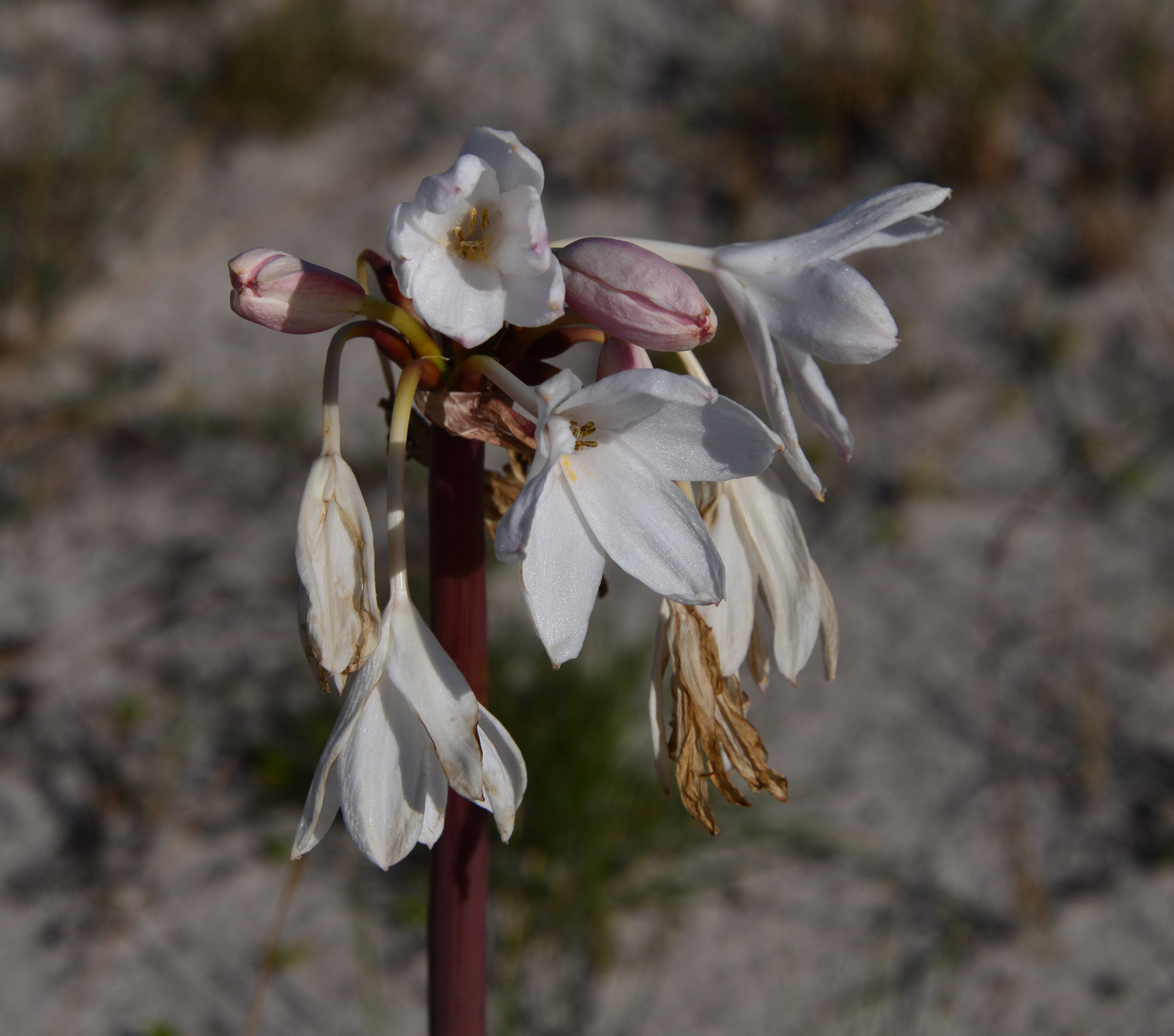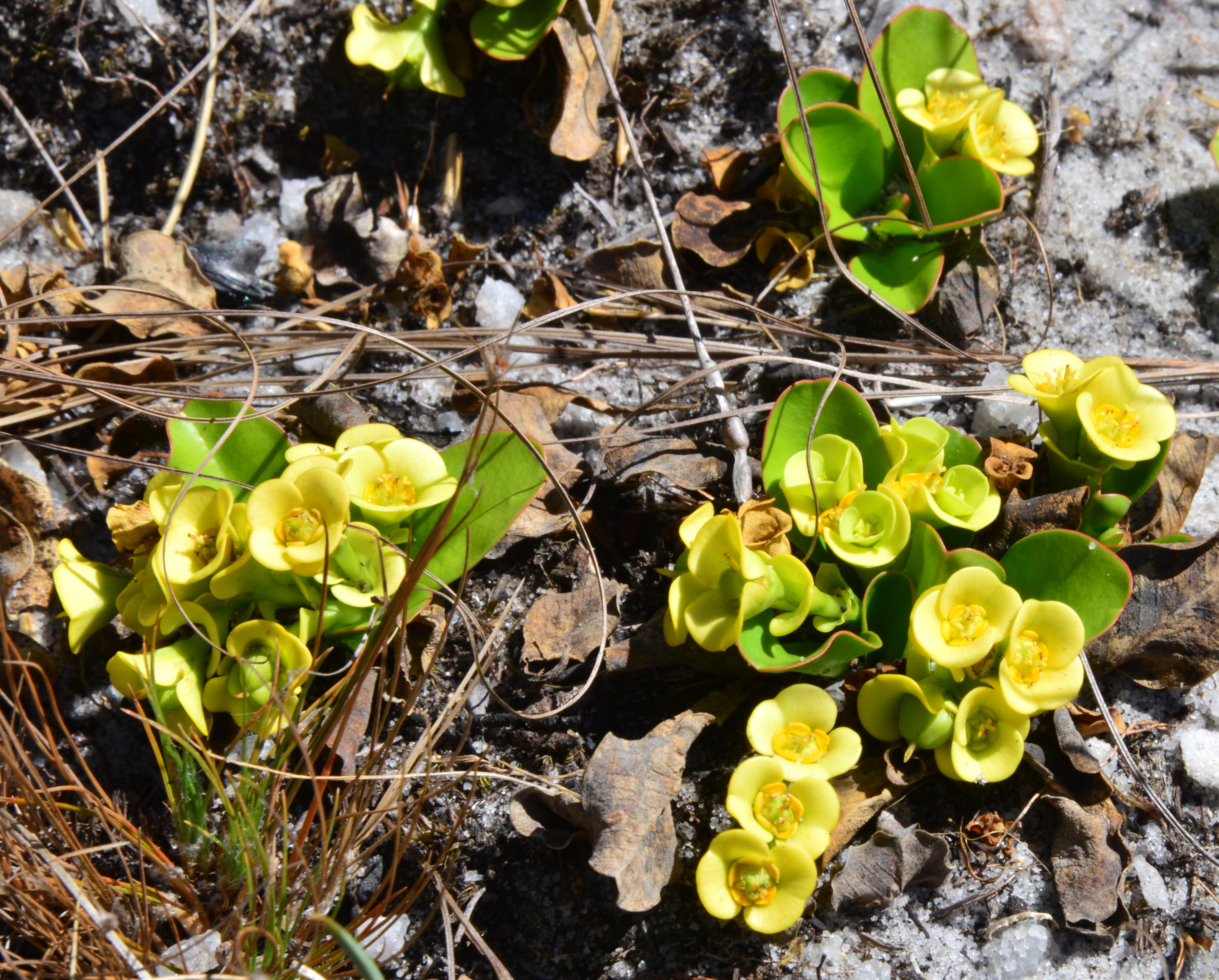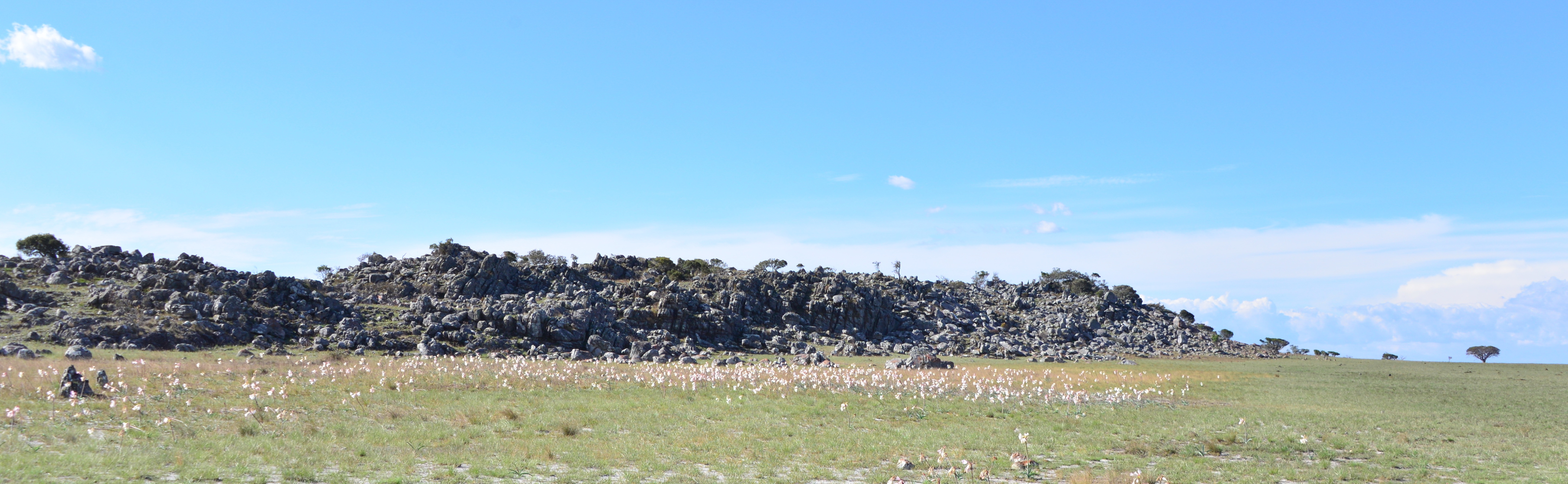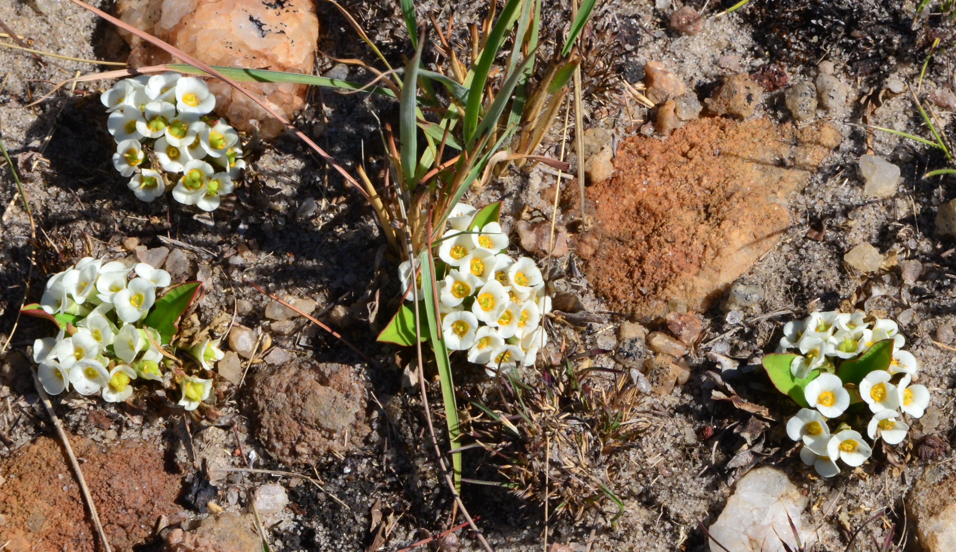 We took a lot of pictures until we noticed that these plants grew in quartz sand and pebbles and that hidden between the grass were hundreds of small plants with yellow flowers: Euphorbia quartziticola, the target plant that we had made this hard drive for! Christophe told us that our planned campsite was near by, se we drove on and were pleased that this area too was covered in the Crinum sp. and on quartz sand / gravel. And sure enough, the ground was covered in yellow flowers!