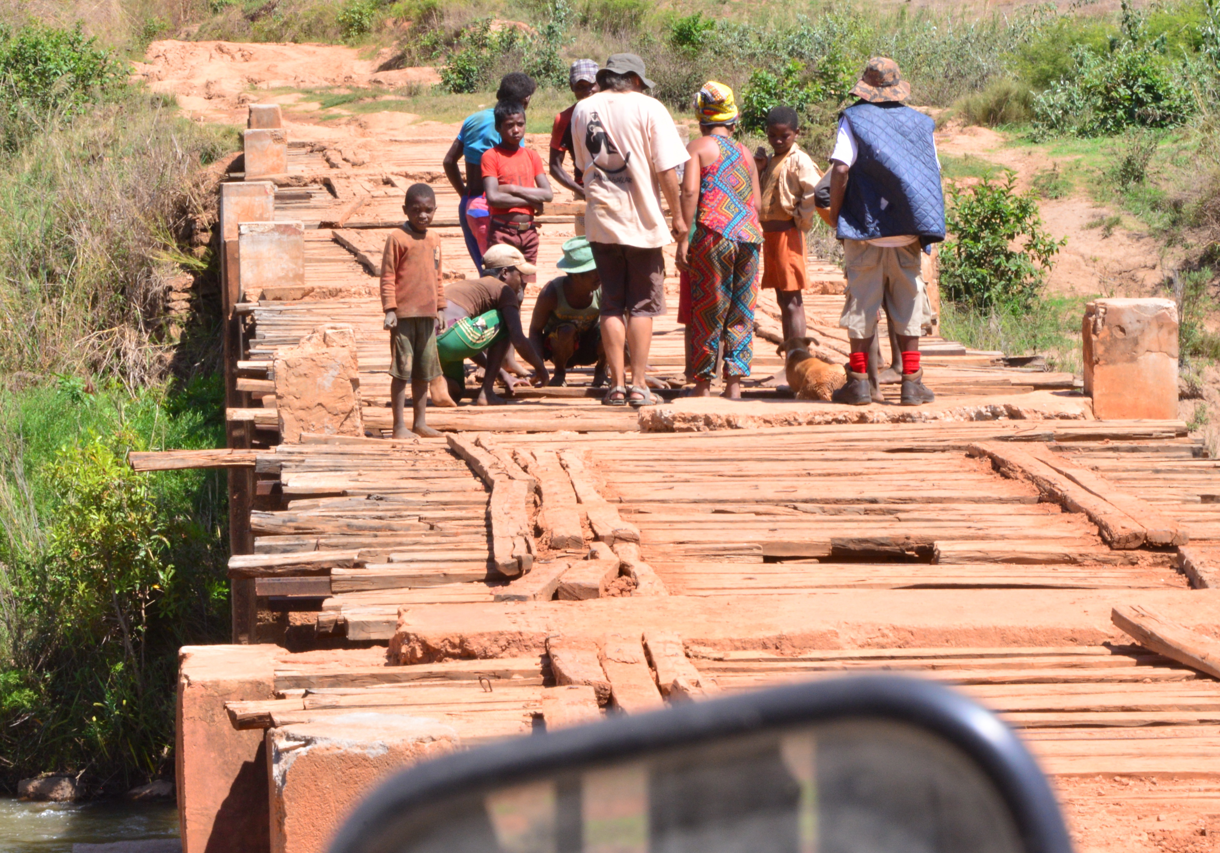 Unfortunately we needed to cross the river to continue our journey. Fortunately there was a bridge, unfortunately it did have a significant number of planks missing. What to do? Jean Baptiste suggested that supply trucks pass along this road and often carry some planks to overcome such events, so suggested a wait. I managed to cross the bridge on foot and after about 500 m came across a second, longer bridge, again with half the planks missing. It should be possible to take planks from this bridge to the first bridge, fix it, cross it and then strip down #1 to fix bridge #2. The plan was communicated to the twenty or so members of the community of all ages who started the task of moving wood immediately, leaving a small team of negotiators to agree the price of the work. 10,000 ariary, about £2.50, for both bridges and an assurance that our team of bridge builders would still be available the following day to reverse the task and allow us over again for the same price.
